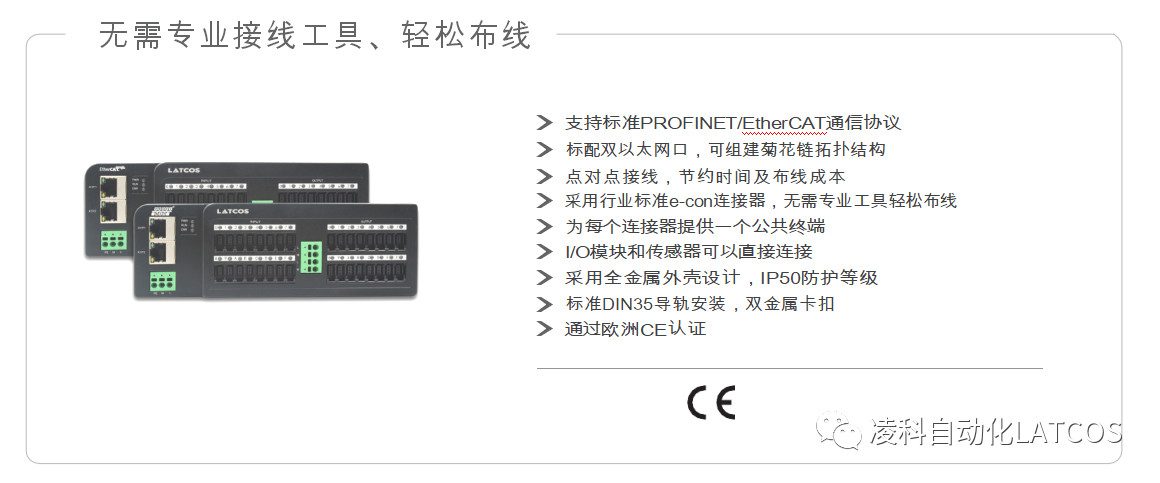 MR系列面板式分布式I/O支持標(biāo)準(zhǔn)PROFINET/EtherCAT通信協(xié)議,可以作為西門子S7-1200/1500,倍福、歐姆龍、CODESYS等PLC主站的從站單元來使用,通過標(biāo)準(zhǔn)的以太網(wǎng)通訊,我們很容易將I/O模塊分布到信號區(qū)域的附近就近接線;同時(shí)由于使用了行業(yè)標(biāo)準(zhǔn)的e-con連接器,我們?yōu)槊總€(gè)輸入輸出點(diǎn)都提供了獨(dú)立的公共終端,使得用戶可以將傳感器、繼電器、接觸器、電磁閥、光電開關(guān)、限位開關(guān)等現(xiàn)場觸點(diǎn)直接與I/O模塊相連接,極大的節(jié)省了時(shí)間及布線成本。