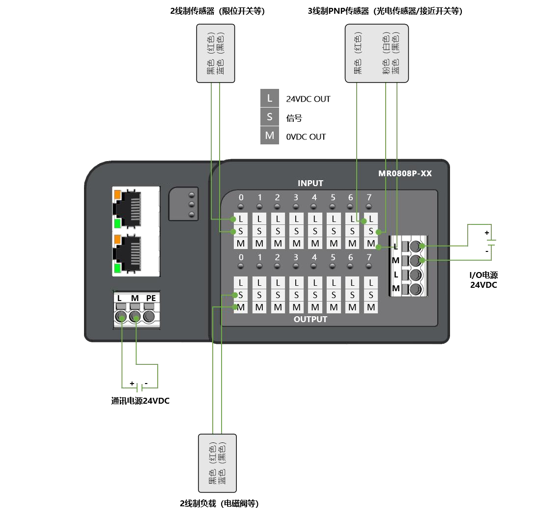電源接口:模塊供電:3P歐式彈簧端子;負載供電:4P歐式彈簧端子