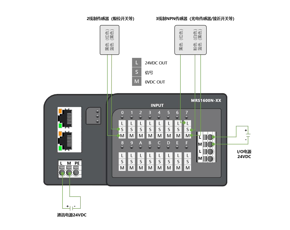 面板式快接線分布式I/O,EtherCAT通訊,2xRJ45,可級聯(lián);數(shù)字量16入 NPN,24VDC,歐式彈簧端子;導軌安裝&打孔安裝(下單時需備注)